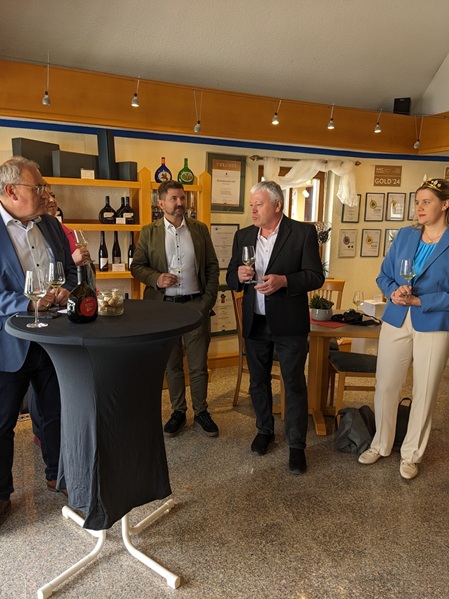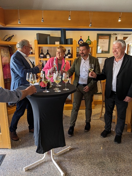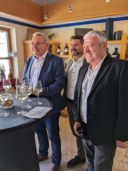 Weinfachberater Ralf Schwarz stellte dem aktuellen „Präsidenten-Wein“ ein exzellentes Urteil aus. In der Nase rieche man Aromen von Pfirsich und Aprikose. Im Glas käme der Wein grazil und leichtfüßig daher, er sei wärmend und animierend zugleich.